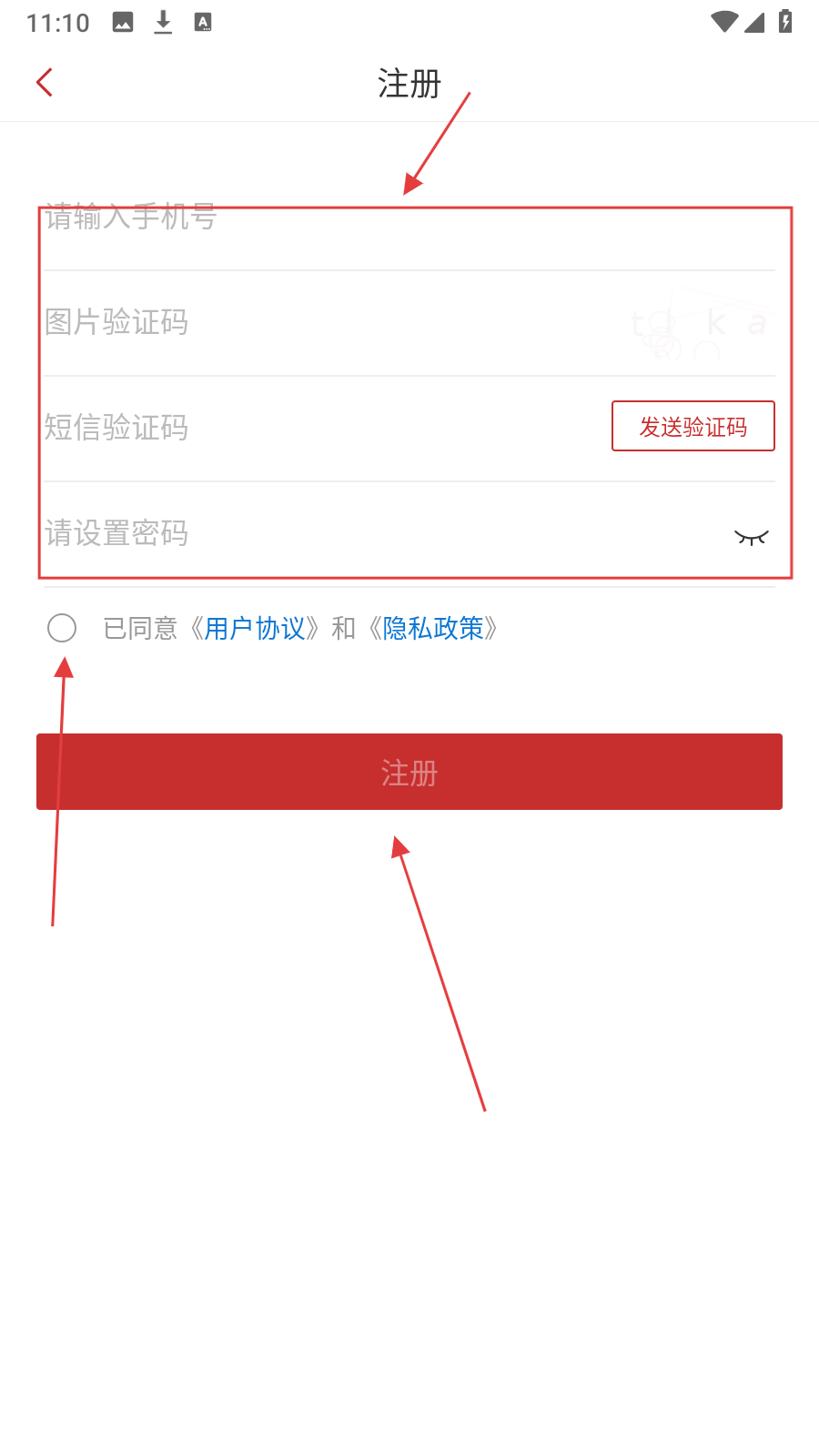 4、输入【手机号、验证码,设置密码,勾选同意协议】后,点击【注册】即可完成注册。