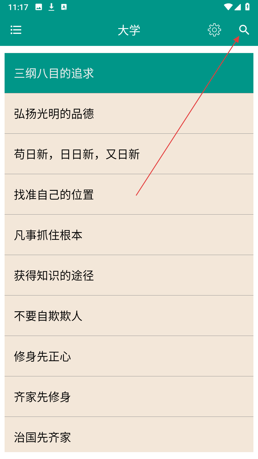 1、在《大学》相关页面,点击【右上角搜索图标】,进入检索页面。
