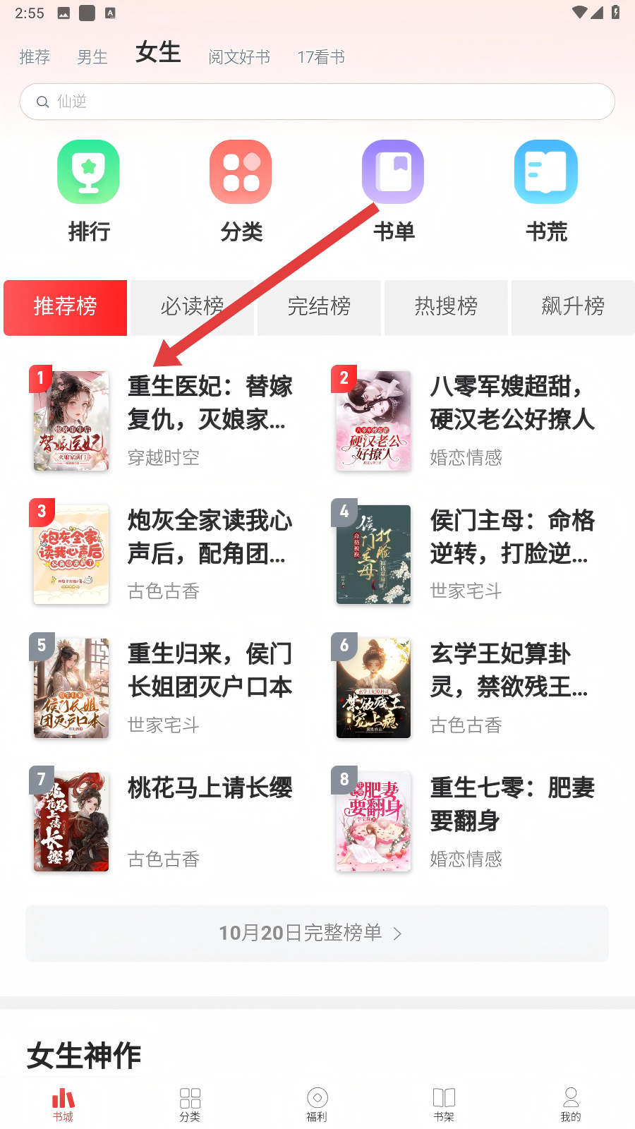 1、我们打开追书神器,在【女生】频道的推荐榜里,点击【重生医妃】,就能进入小说详情页啦。