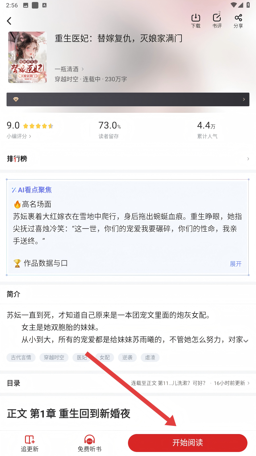 2、之后,咱们点击底部的【开始阅读】按钮,就能进入对应的小说阅读界面哟。