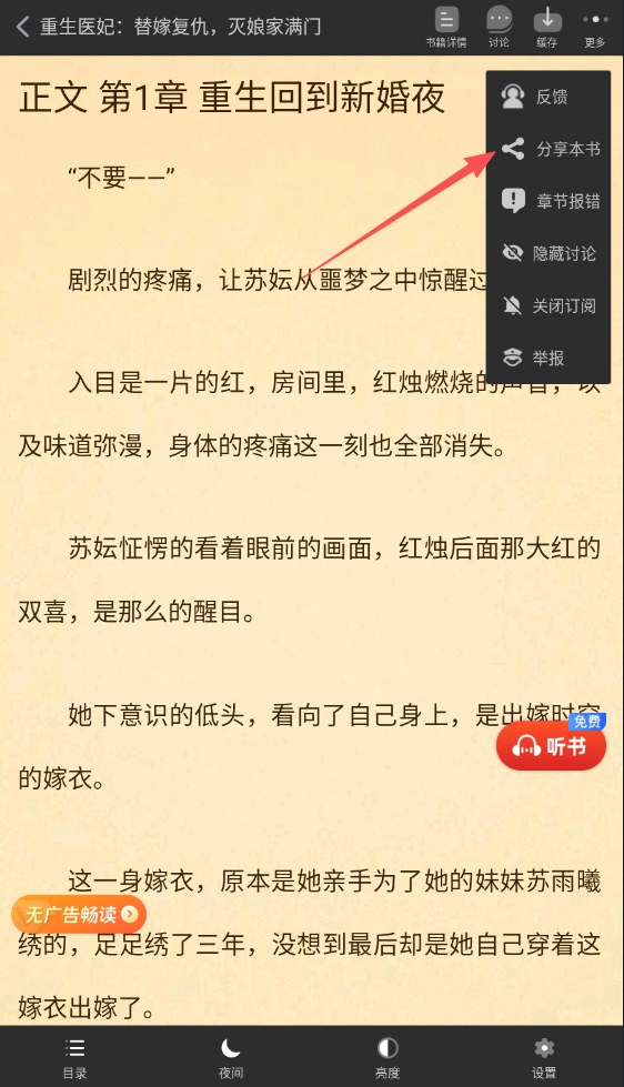 3、在小说阅读界面,点击右上角【更多】,然后选择【分享本书】选项,就能打开分享菜单啦。