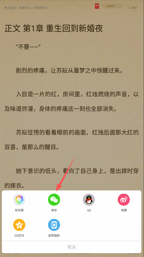 4、打开分享菜单后,我们点击【微信】图标,就可以把这本小说分享到微信,和好友分享阅读乐趣啦。