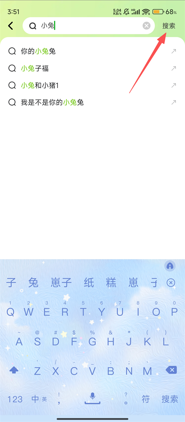 2、在搜索框输入表情包关键词,如【小兔】,点击【搜索】,就离找到可爱表情包更近啦。