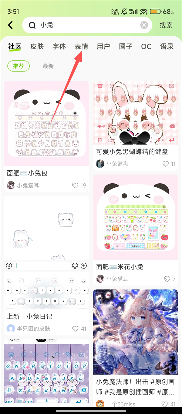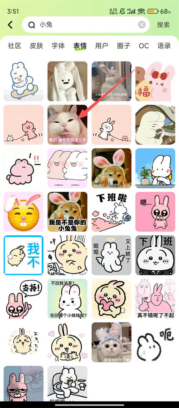 3、搜索后在分类栏选择【表情】,这样就能筛选出各类表情包,方便快速找到喜欢的风格,是不是很贴心呢。