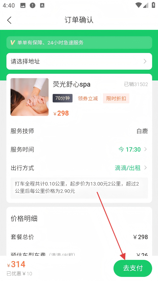 4、在订单确认页面,选择地址、确认服务时间等信息后,点击【去支付】,完成服务预约与支付。