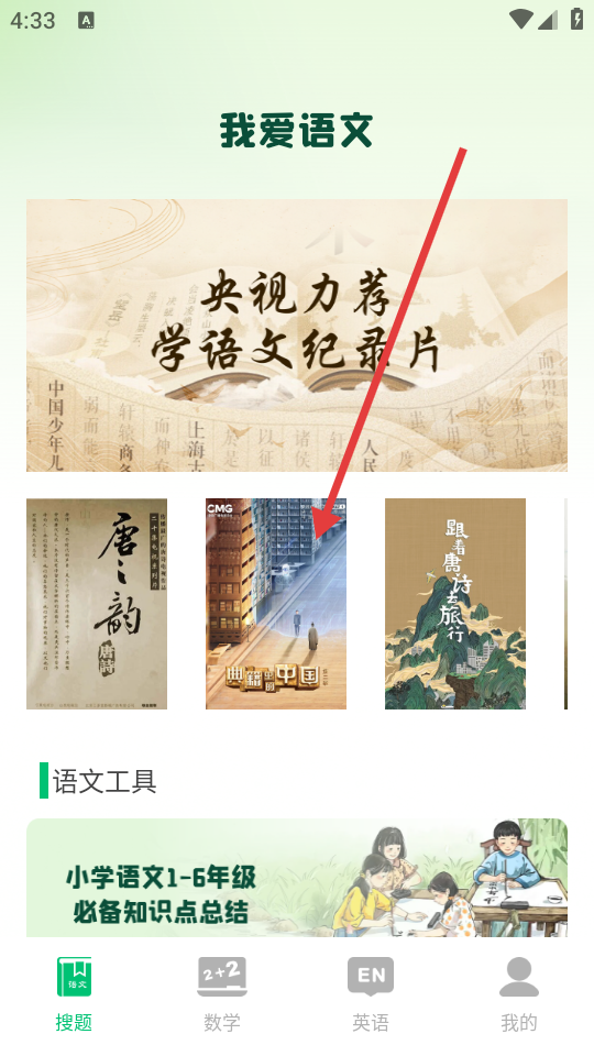 1、点击底部【搜题】,进入“我爱语文”页面,可查看央视力荐学语文纪录片等内容,使用语文工具。