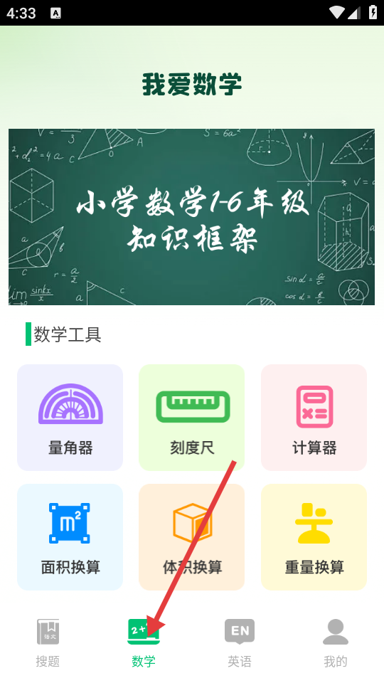 2、点击底部【数学】,进入“我爱数学”页面,可查看小学数学知识框架,使用数学工具。