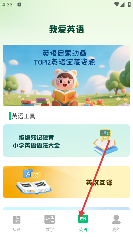 3、点击底部【英语】,进入“我爱英语”页面,可查看英语启蒙动画等资源,使用英语工具。