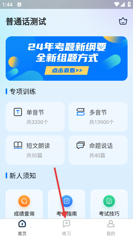 1、进入app首页,点击底部【练习】按钮,进入练习页面。