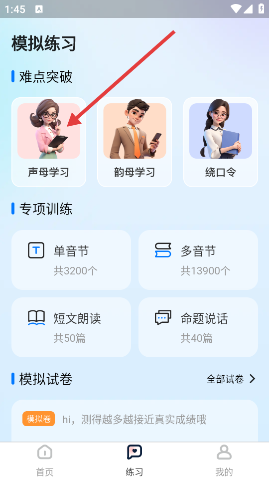 2、在练习页面,选择感兴趣的练习,开启声母相关学习。