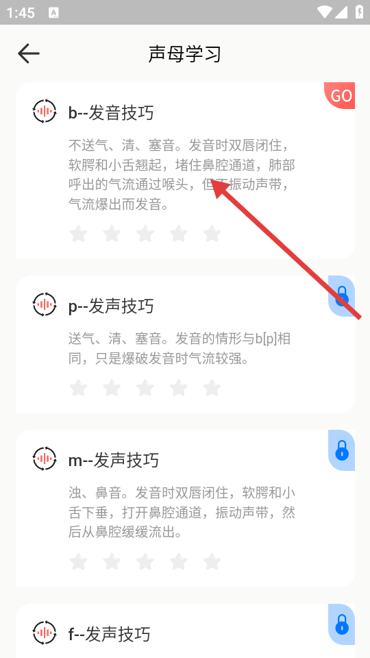 3、进入声母学习后,查看【发音技巧】,掌握其发音方法。