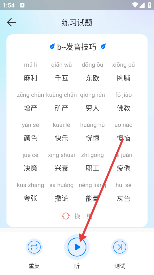 4、在练习试题页面,点击【听】按钮,聆听相关字词发音来练习。