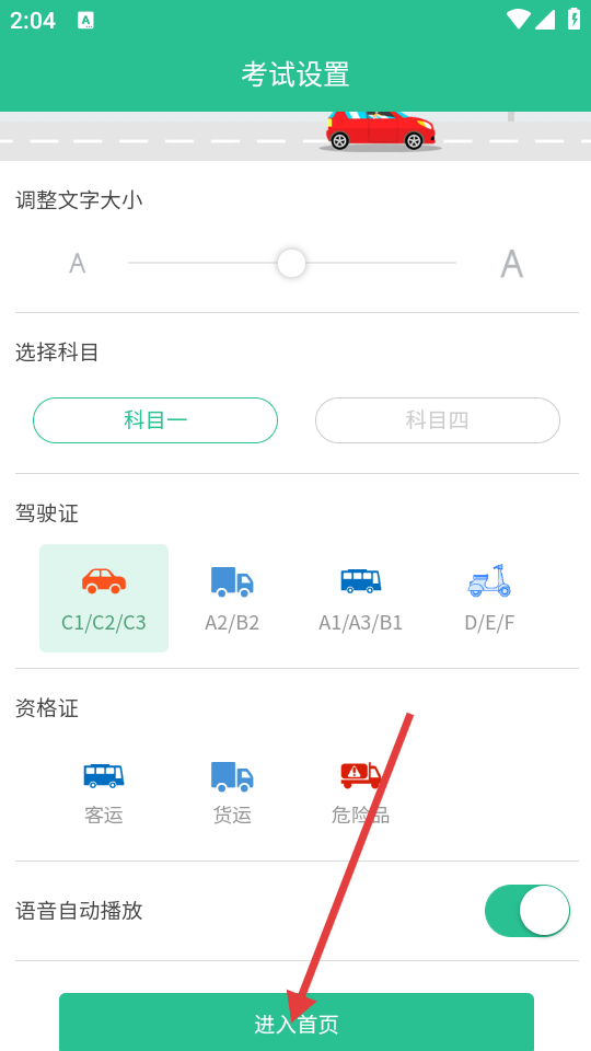 1、在考试设置页面,选好文字大小、科目、驾驶证等,点击【进入首页】。