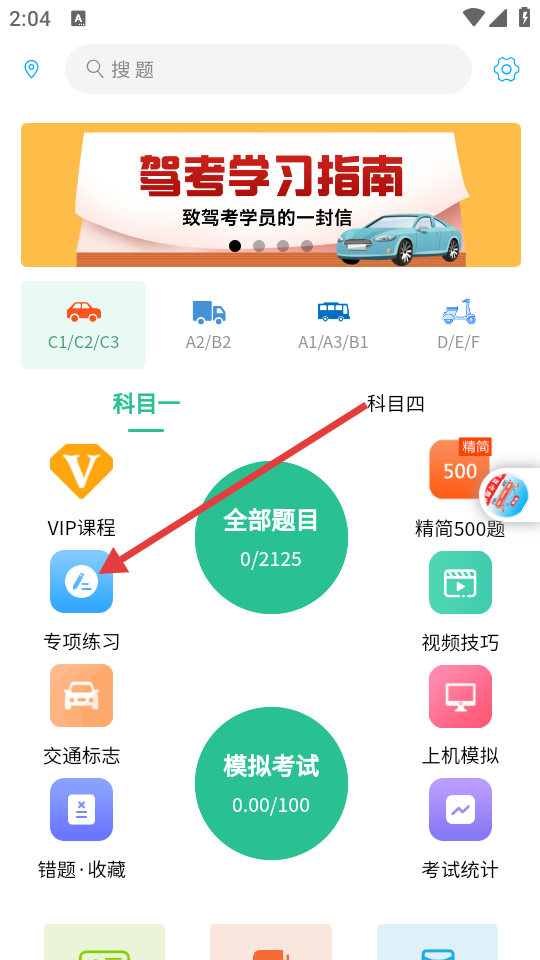 2、进入首页后,在科目一板块中,点击【专项练习】。