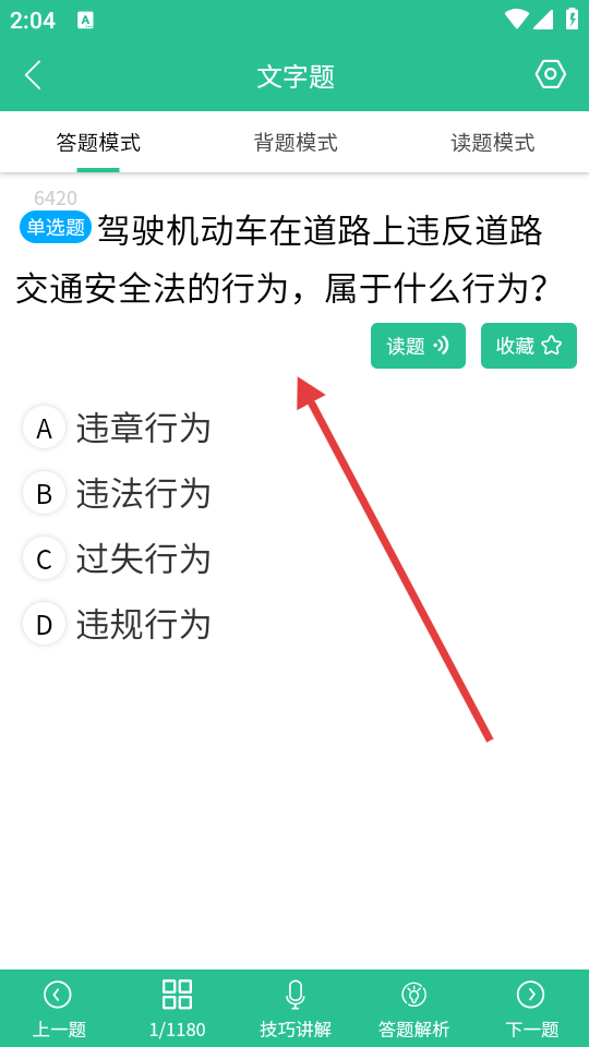 4、在文字题页面,可查看题目,还能使用读题、收藏等功能做题。