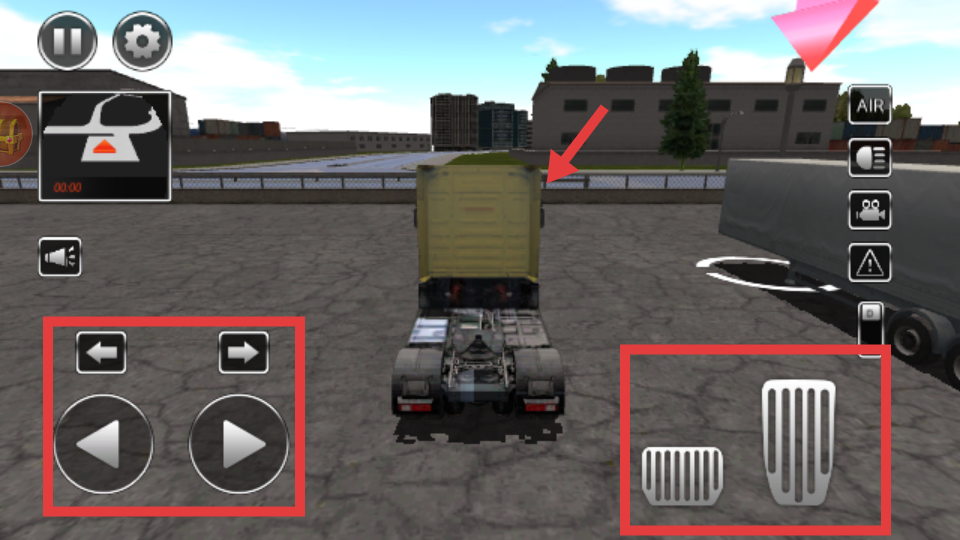 2、驾驶时,用左侧按钮控制方向,右侧踏板分别对应油门与刹车,操控卡车移动。