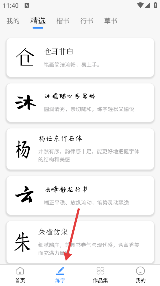 2、“练字”页面有仓耳非白、沐瑶随心手写体等多种字体,可选择练习。