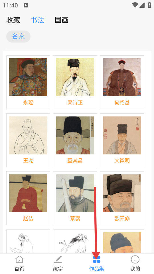 3、“作品集”页面展示永瑆、梁诗正等名家相关内容,可浏览学习。