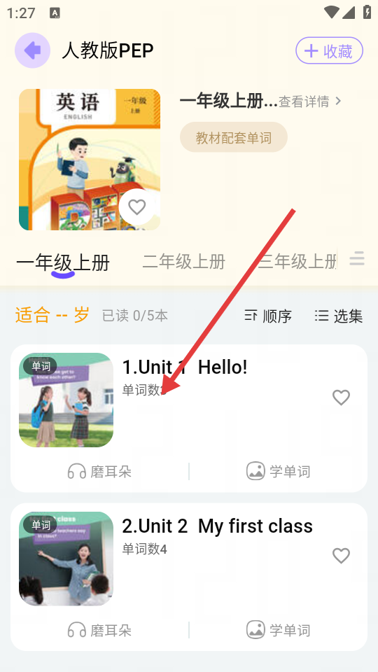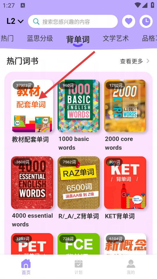 1、在首页【背单词】板块,选择所需词书,进入对应教材学习页面。
