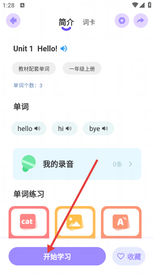 3、进入单元学习页面,查看单词个数等信息,点击【开始学习】,进入单词学习环节。