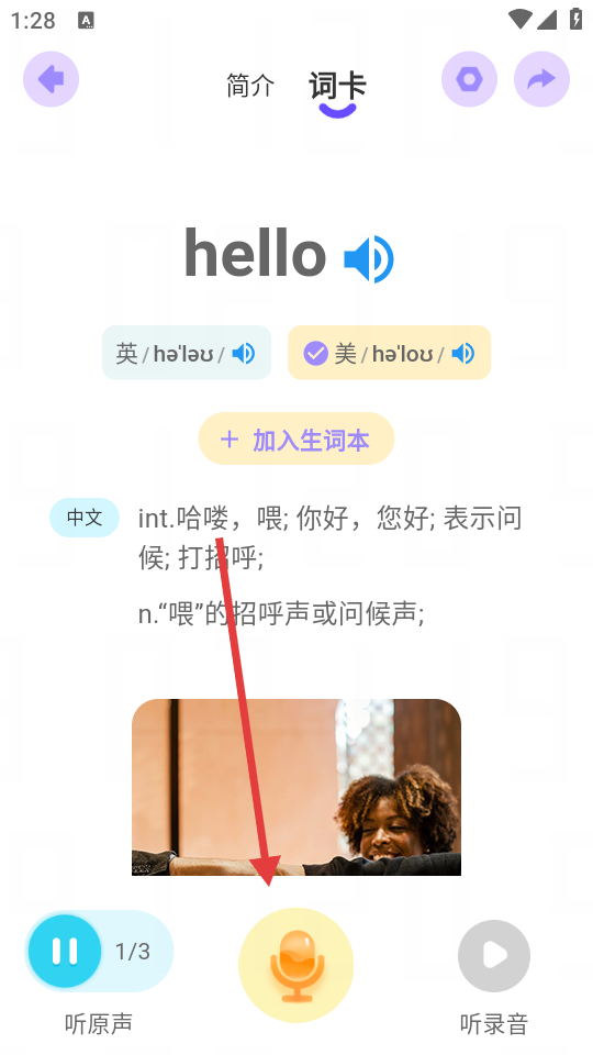 4、在词卡页面,可听单词的英、美发音,还能进行录音练习,也可将单词加入生词本。