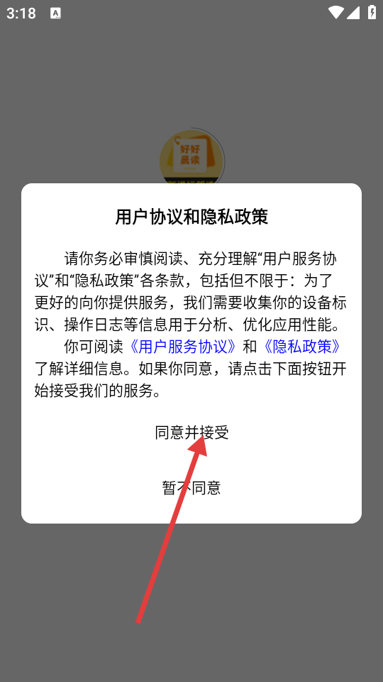 1、首先需阅读并确认“用户协议和隐私政策”,点击“同意并接受”。