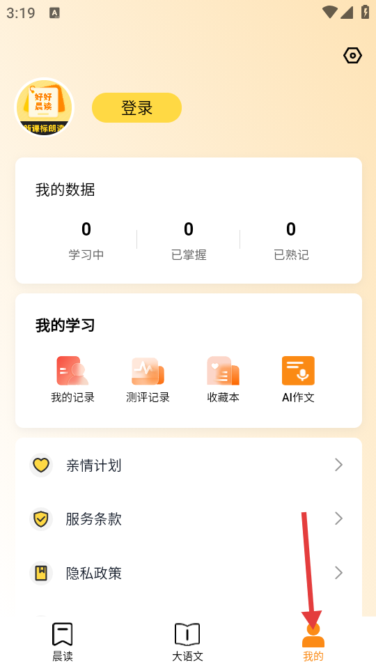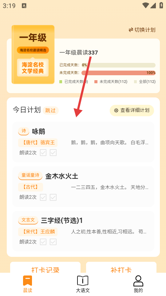 2、点击【晨读】,可查看对应年级的晨读计划,进行朗读学习。