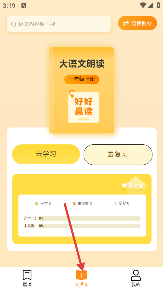 3、点击【大语文】,可选择“去学习”或“去复习”大语文朗读内容,查看学习进度。