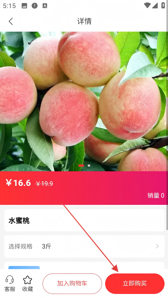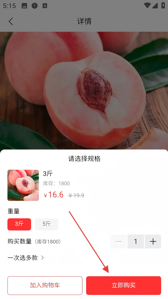 3、在水蜜桃详情页,点击【立即购买】按钮,进入规格选择界面。