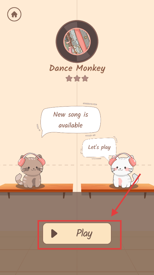 1、选择【DanceMonkey】歌曲后点击【Play】按钮,即可进入关卡跟随音乐节奏操控两只猫咪接取美食。