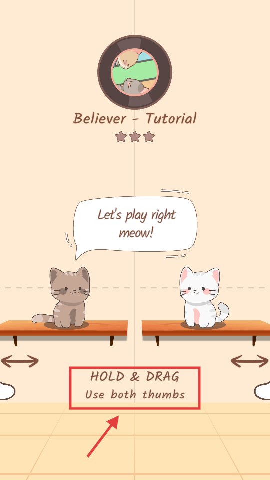 2、按照【HOLD&DRAG】-【Useboththumbs】提示,用双拇指按住并拖动两只猫咪完成教程基础操作。