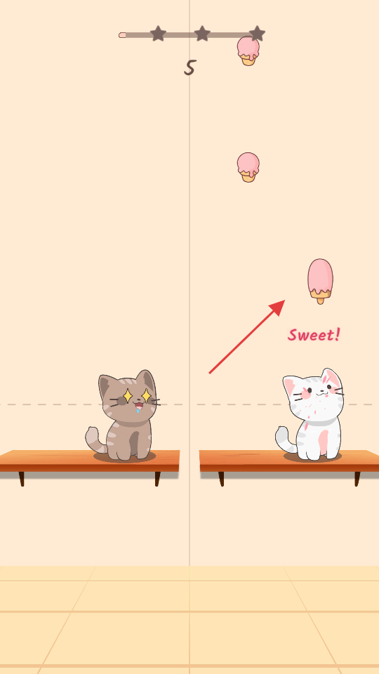 3、观察冰淇淋下落位置,将猫咪快速移动到下方接住获【Sweet】评价,需避开陷阱食物防止扣分。