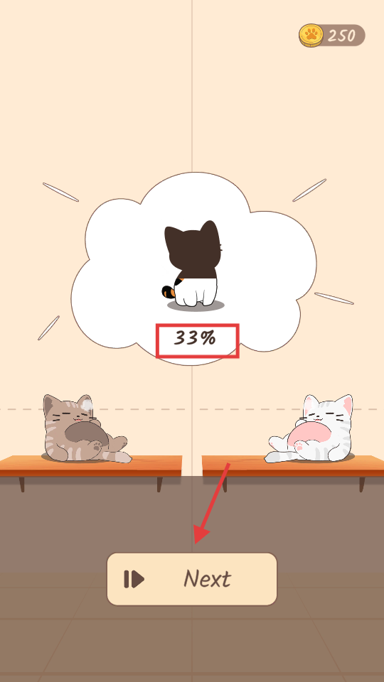 4、完成关卡后看到【33%】进度与【250】金币,点击【Next】按钮进入下一曲目继续挑战。