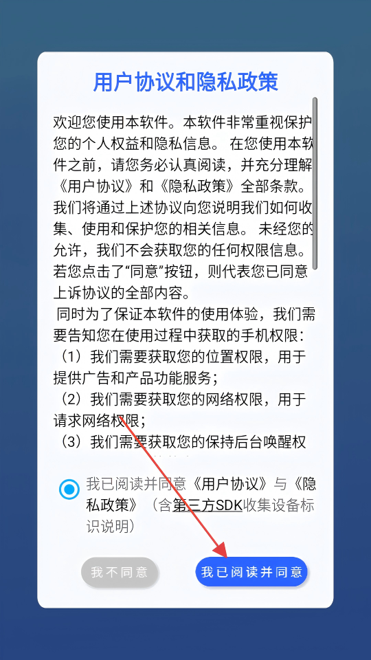 1、在“用户协议和隐私政策”弹窗中,点击【我已阅读并同意】,进入软件首页。