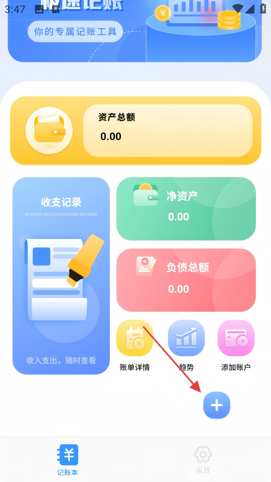 2、在软件首页,点击右下角的【+】号,进入支出或收入的记录页面。