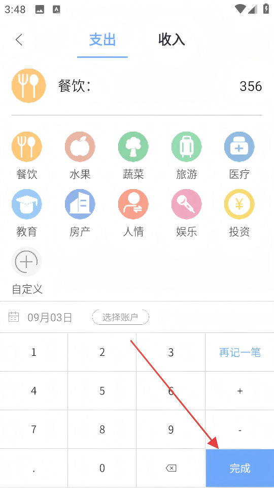 3、在支出记录页面,选择支出类别,输入对应金额后,点击【完成】来记录该笔支出。
