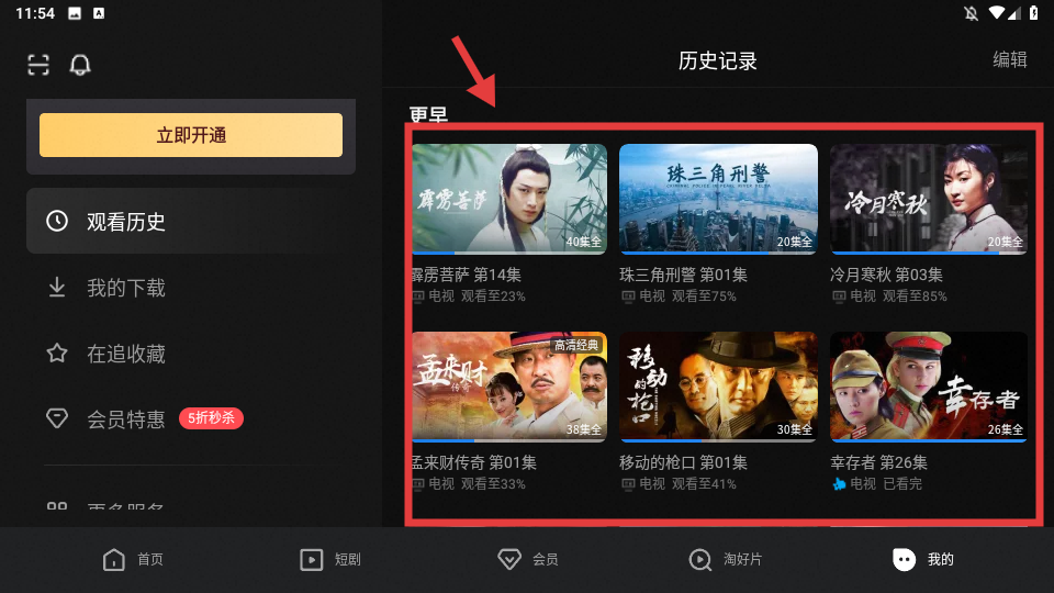 4、登录后,在“观看历史”页面可查看过往观看的视频记录。