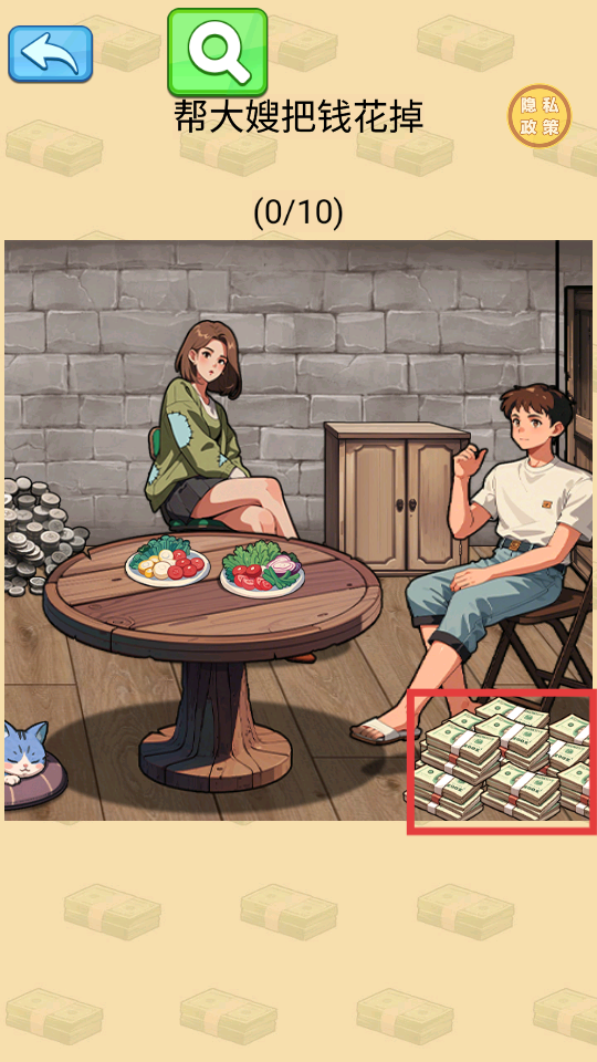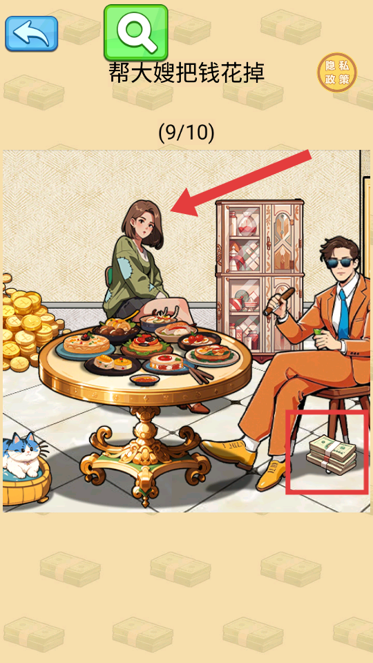 2、进入【帮大嫂把钱花掉】关卡,找到画面中红框内的【现金】,将其移动至场景进行改变。