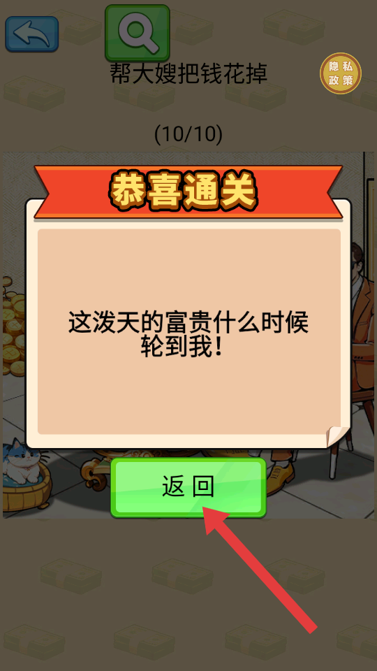 4、完成【10/10】的花钱任务后,出现【恭喜通关】提示,点击【返回】按钮回到主界面。