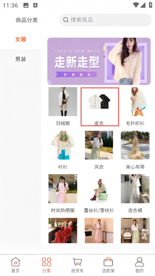 1、在分类页面,选择女装分类里的【皮衣】选项,进入皮衣商品列表。