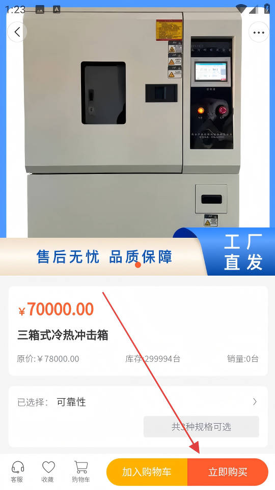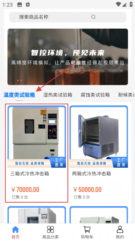 1、在首页“温度类试验箱”分类下,点击【三箱式冷热冲击箱】商品,进入商品详情页。