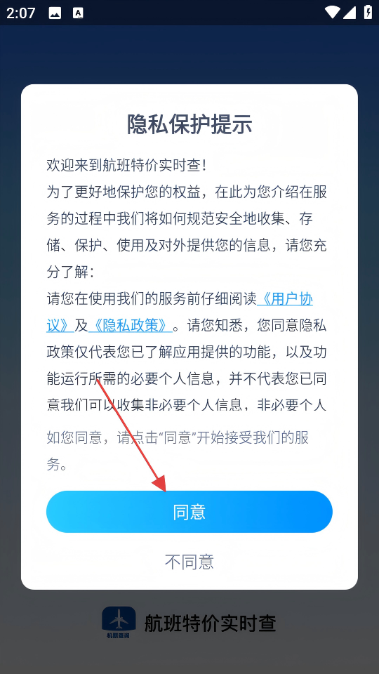 1、打开航班特价实时查APP,在隐私保护提示弹窗点击【同意】,进入应用主界面。