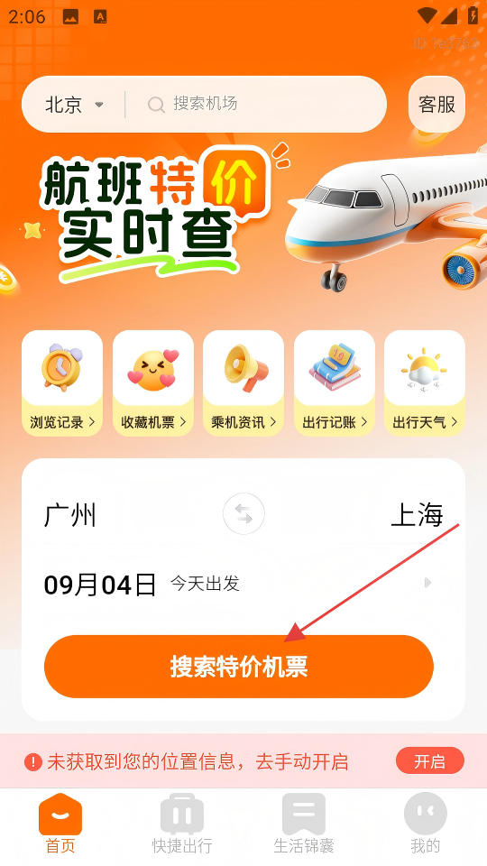 2、在主界面设置出发地、目的地和出发时间,点击【搜索特价机票】按钮。