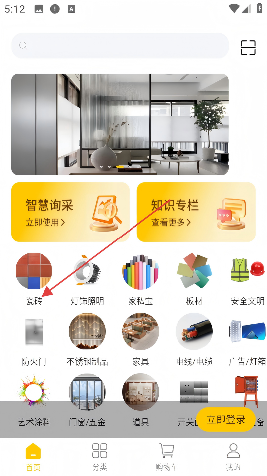 1、在首页点击【瓷砖】分类图标,进入瓷砖商品列表页面。