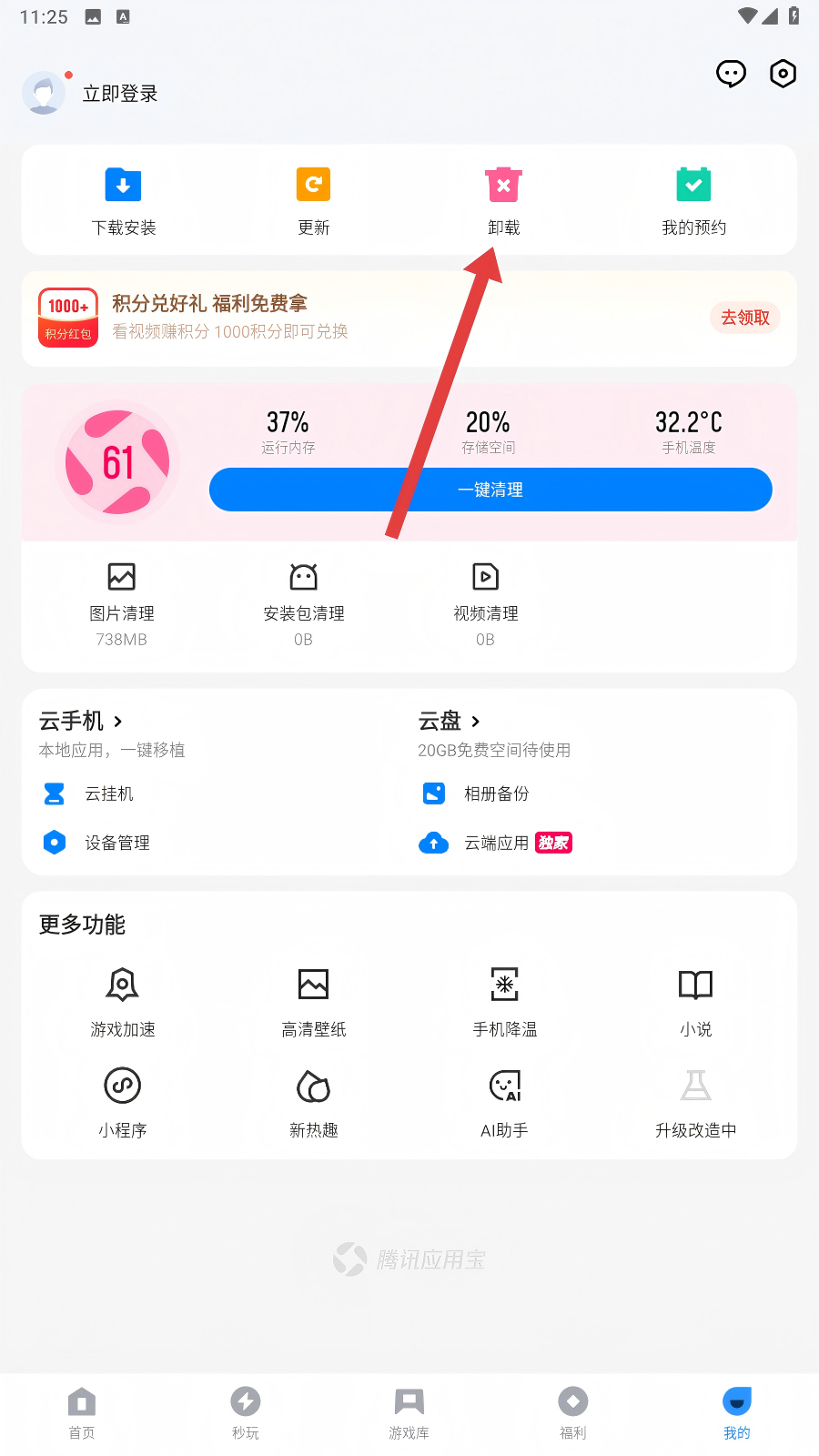 2、在【我的】页面里,找到【卸载】选项,点击它就能进到应用卸载界面咯。