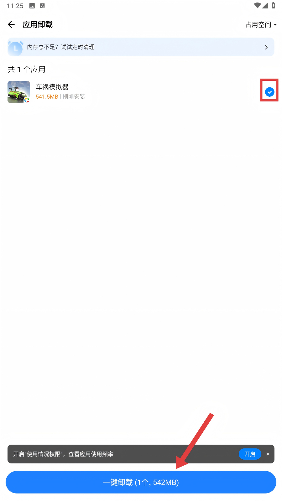 3、到应用卸载页面后,勾选要卸载的应用,接着点击【一键卸载】按钮。