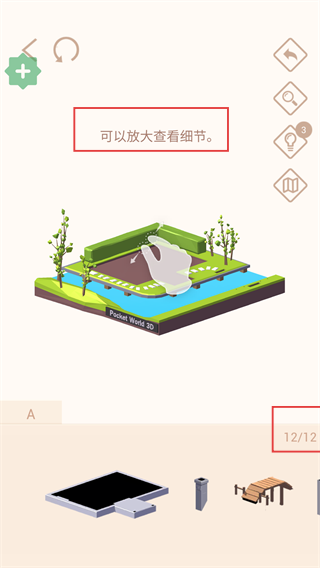 2、拼接模型时,可按提示【放大查看细节】,确认部件位置,当前进度【12/12】可准备完成拼接。