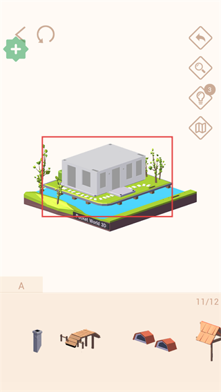 4、在基础区域上拼接【主体建筑部件】,完成后进度更新为【11/12】,继续补充剩余细节部件。