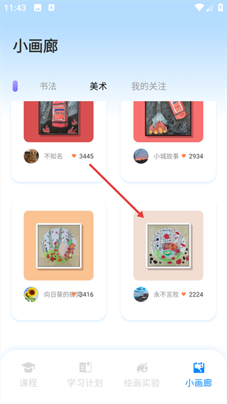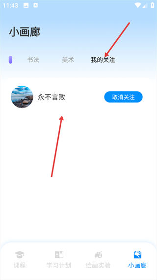 4、返回小画廊页面,切换至“我的关注”标签页,可查看刚才关注的作者。