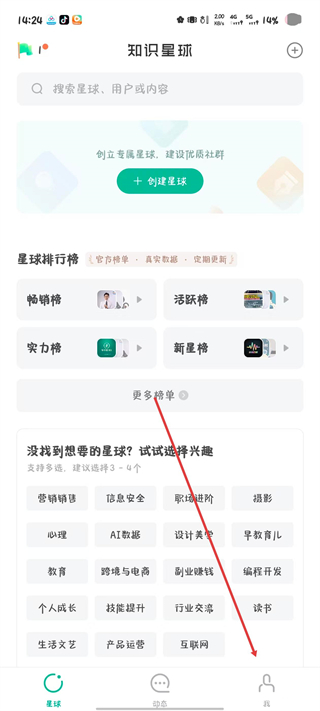1、打开知识星球进入星球页面,点击底部我的选项,进入个人页面。